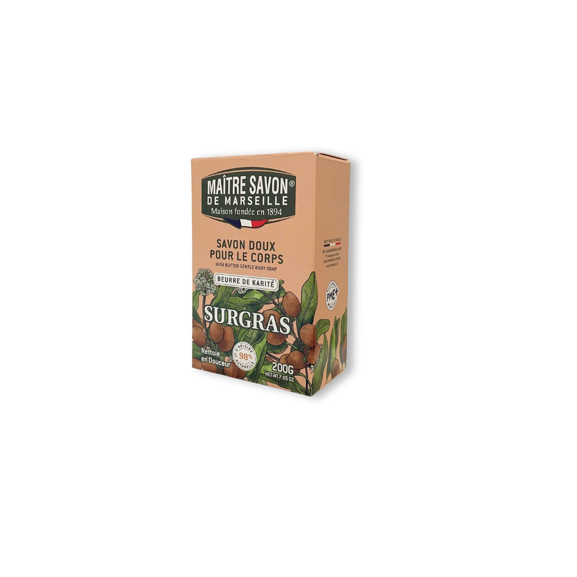 Savon de Provence conçu à partir d'huiles 100% d'origine végétale et enrichi en beurre de karité, ingrédient reconnu pour ses vertus nourrissantes et adoucissantes.